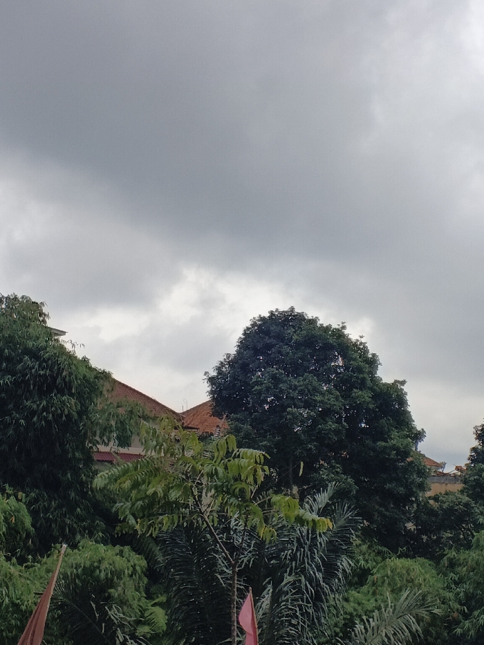 A cloudy sky looms over a view dominated by lush foliage and hints of red-tiled rooftops. Tall trees with dense, green canopies fill the scene, while other plants with vibrant green leaves provide textural variety. The structures peek through the greenery, suggesting a residential area or buildings nested among the trees. Flags add a splash of color to the scene. Overall, the image captures a serene, overcast day.