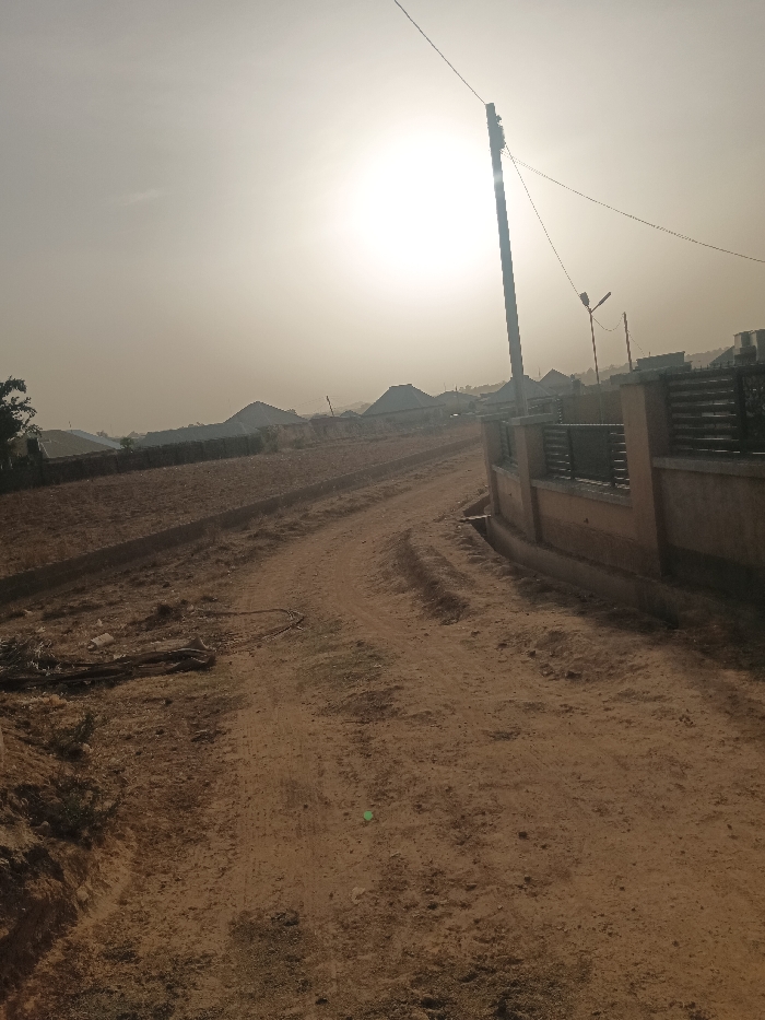 A dusty, unpaved road winds through a residential area under a bright, hazy sun. Simple houses with sloping roofs line the horizon. To the right, a fence of corrugated metal tops a tan wall. A utility pole stands tall, holding up power lines. The ground is arid and uneven, with sparse vegetation and scattered debris. The overall scene suggests a developing or rural area.