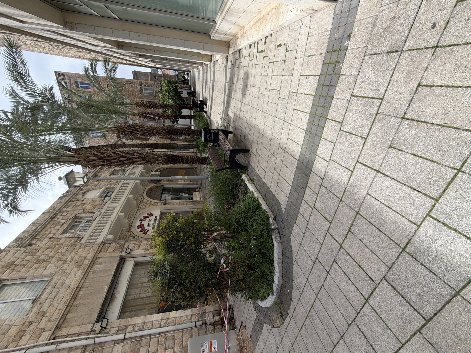 The image captures a street scene in Haifa, Israel. The street is paved with light gray rectangular stones, oriented diagonally. A darker gray stone border runs along the right side of the pavement. A row of date palm trees lines the left side of the street. Benches are positioned along the walkway. In the background, a building with arched windows and a sign in Hebrew and English, "JAPANESE CUISINE", is visible. Utility boxes and warning tape are present near the base of the building. The sky is overcast.