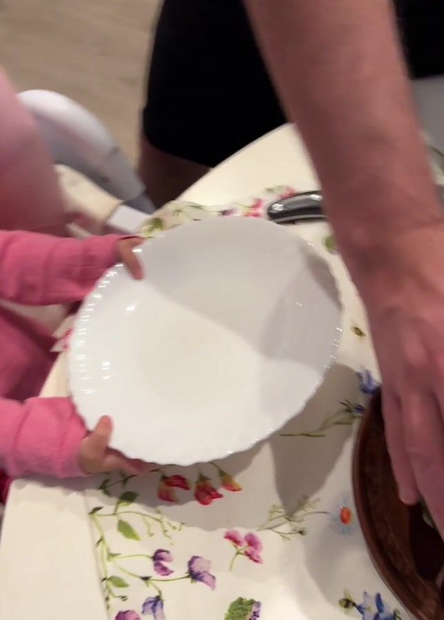 Here's a detailed description of the video: The video shows a man cutting a watermelon on a table while a baby watches from a highchair. The baby, wearing a pink long-sleeved shirt, holds a white plate on the table. The man uses both hands to open the watermelon, which is already cut into wedge-shaped segments. He separates the segments so that they fall slightly outwards, revealing the red, juicy interior of the watermelon. The watermelon rests on a brown plate with a slightly raised rim. The table is covered with a white tablecloth featuring a floral pattern with colorful flowers. The man wears a black t-shirt, and his hands are visible as he handles the watermelon. A knife is partially visible in the background.