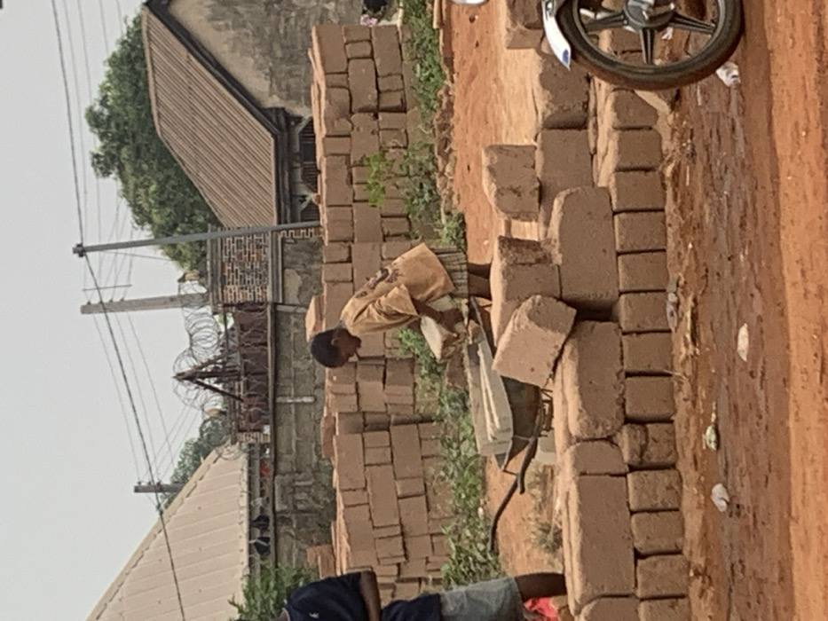 This image captures an outdoor construction or material staging area in Aguleri, Nigeria, under an overcast sky