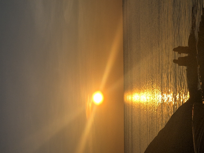 The image displays a coastal scene during sunset in Ko Tao, Thailand. The sun, a bright golden orb, is positioned low above the horizon, centrally across the middle third of the frame, casting a prominent, shimmering reflection path directly onto the calm water below. The sky transitions from a brilliant orange-yellow around the sun to a muted grey-blue in the upper portions. The sea surface is smooth, reflecting the warm light. In the foreground, two human figures are silhouetted, seated on dark, irregular rock formations at the water's edge in the lower right quadrant, facing the sunset. A larger, dark landmass or rock outcrop occupies the lower left quadrant of the frame, partially obscuring the immediate shoreline. The scene is static, with no discernible active interactions between the figures beyond their shared orientation towards the setting sun.