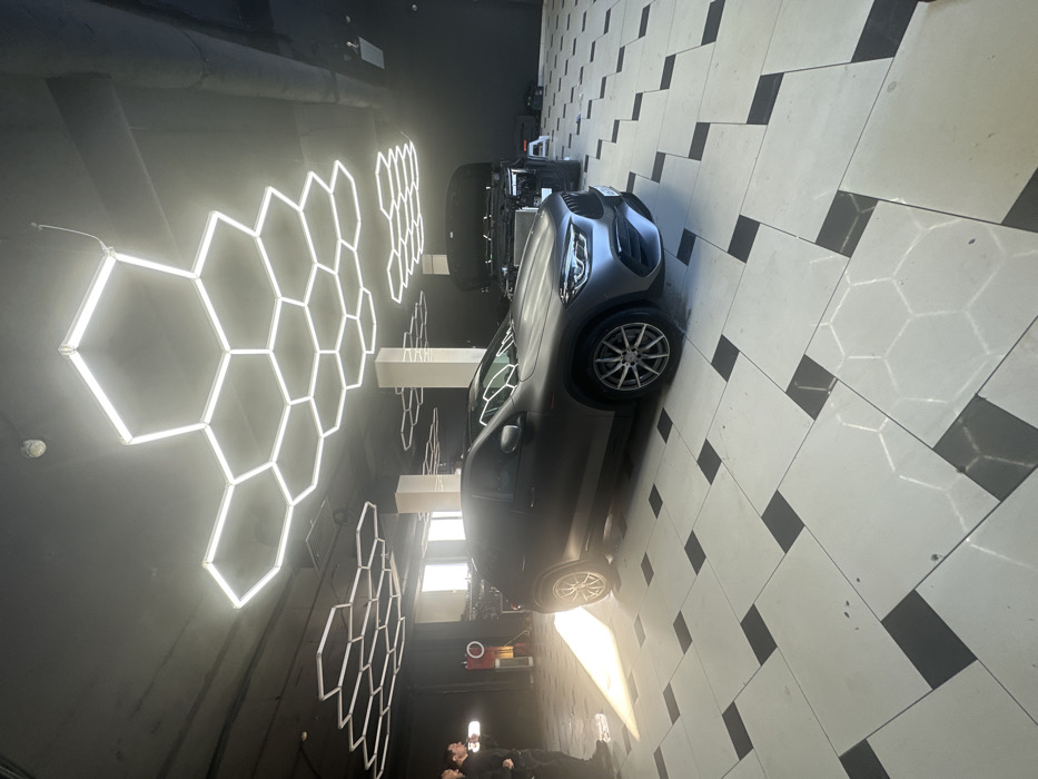 The image captures an interior scene of an automotive detailing or service center located in Saint Petersburg, Russia. The facility features a dark ceiling extensively illuminated by multiple clusters of white, hexagonal LED light fixtures. The floor is covered in a geometric pattern of large light-colored tiles interspersed with smaller dark square tiles. In the mid-ground, a dark grey (potentially matte finish) Mercedes-Benz GLA-class SUV is parked, angled towards the right side of the frame, showcasing its front and left profile. Its alloy wheels are dark and feature multiple spokes. To the left of this vehicle, two individuals in dark clothing are partially visible. One individual holds and directs a bright, rectangular hand-held light source, casting an intense beam onto the side of the grey SUV. In the background, positioned to the right of the primary vehicle, a second dark-colored SUV, possibly a Jeep Wrangler, is present with its hood open, indicating ongoing work or preparation. The walls are predominantly dark, with a large window visible on the far left allowing some natural light. A prominent white support pillar stands near the center-left of the room, and a red fire extinguisher is mounted on the left wall. The overall environment is well-lit and appears to be a professional automotive workshop.