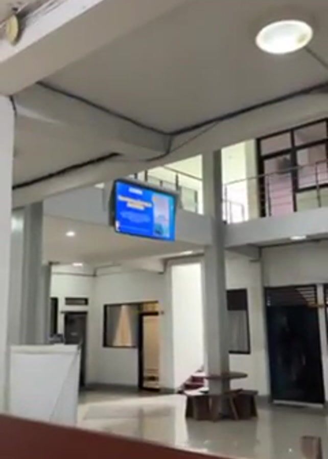 The camera pans up to reveal a digital display screen in a building with white columns and open hallways. The screen reads "Narotama Campus Activities" with an image of students in a hallway. The building appears to be a university or office space with a multi-level layout. There is a small wooden table with attached seating in the open space and doorways leading to other rooms. The lighting is bright from ceiling fixtures. Wires and pipes run along the ceiling.