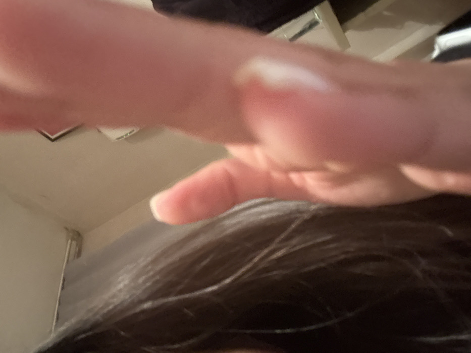 An indoor scene is captured in Mirovyane, Bulgaria. The central and right foreground is dominated by a heavily blurred, light-skinned human hand, appearing to be extended towards the camera and obstructing most of the view. The thumb is visible on the lower left aspect of the hand, while the remaining fingers are indistinct due to significant blur. To the left of the hand, a section of dark, straight hair is visible. The background reveals a light-colored wall or ceiling surface, with a segment of conduit or piping discernible near the upper left corner. On the far right, a dark garment is partially visible adjacent to a light-toned piece of furniture or shelving. A dark-framed object is faintly discernible on the wall further back.
