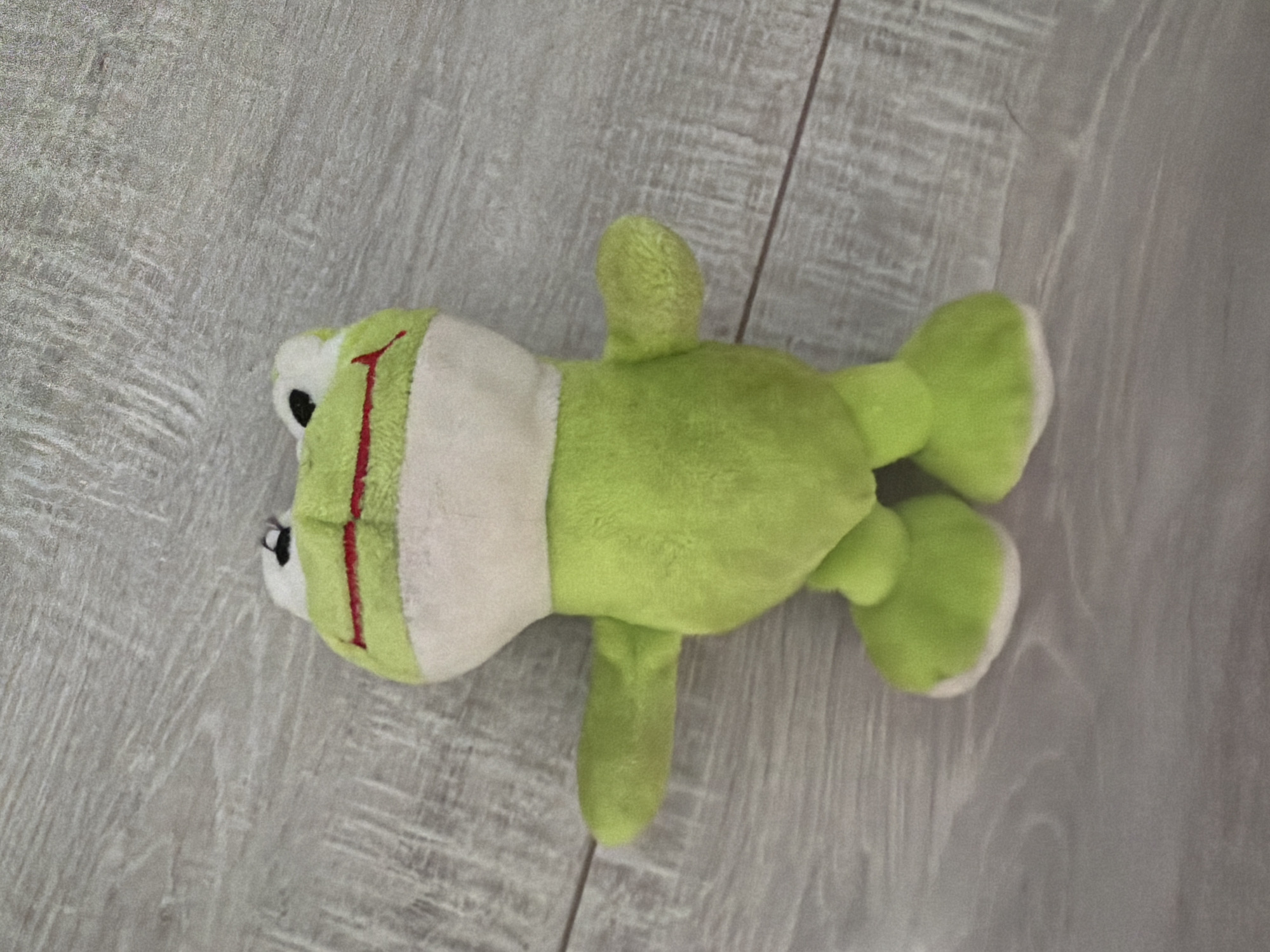 A stuffed, green frog with a white belly is lying on a light grey wooden floor. The frog is positioned sideways with its head facing the left side of the image. The frog has black and white eyes with red stitching around them. There are no people visible in the image. The location is not identifiable.