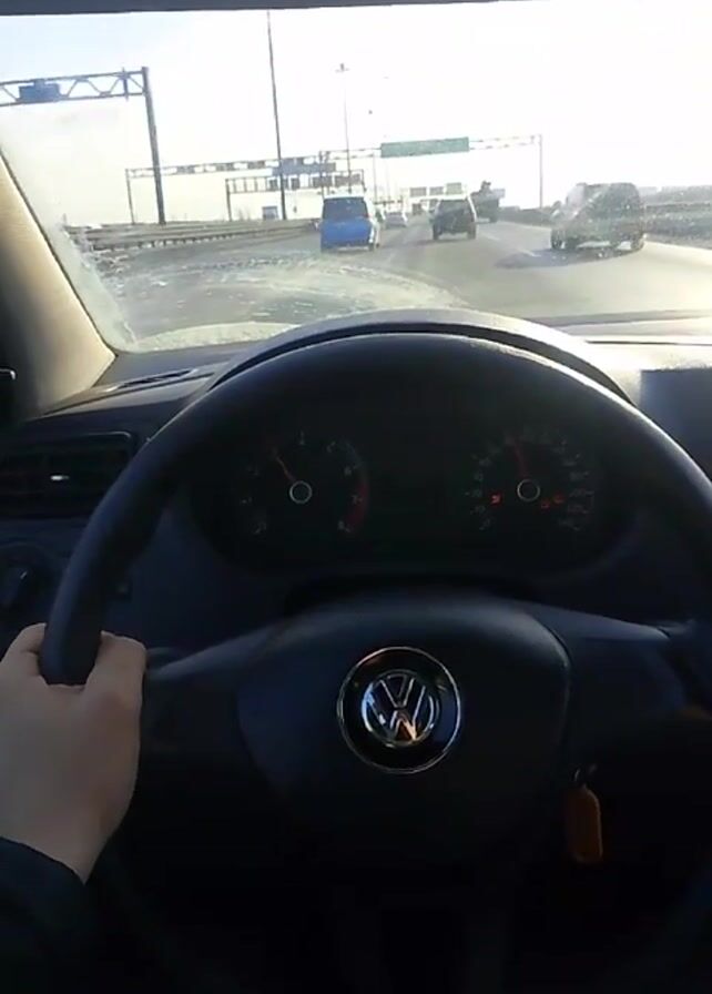 first-person perspective from inside a car, driving on a highway. The driver's left hand is visible on the steering wheel, which features a Volkswagen logo. The car's dashboard is visible, displaying the speedometer and other gauges. Through the windshield, other cars and highway infrastructure such as overhead signs can be seen. The weather appears clear, and it's daytime. The road seems wet.