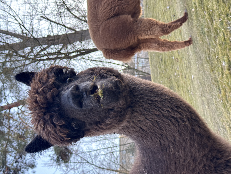 An outdoor, eye-level photograph depicts two alpacas within the Zoologischer Garten Berlin, Germany. In the foreground, a dark brown alpaca with densely curled fur on its head faces the camera, its dark eyes visible. Green plant matter is lodged in its mouth, suggesting recent grazing. Its prominent neck extends down and left, out of frame. In the mid-ground to the right, the hindquarters and legs of a second, reddish-brown alpaca are visible as it walks away, its fur appearing thick and uniform. Both animals stand on a gently sloping, yellowish-green grassy terrain. The background consists of numerous bare deciduous trees and a single evergreen tree, under a pale blue sky. Faintly visible through the bare branches in the far distance are light-colored buildings. Natural daylight illuminates the scene.