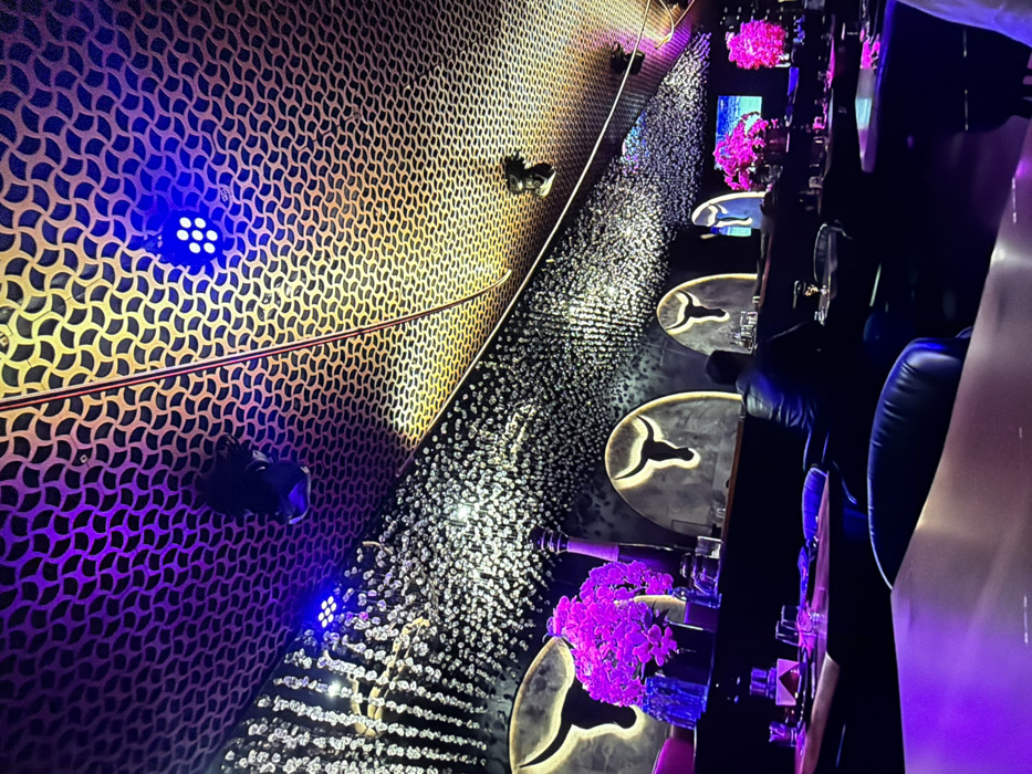 The image displays the interior of an upscale restaurant or lounge located in Burgas, Bulgaria, characterized by distinctive decor and lighting. The ceiling features two primary sections: a golden-patterned overhead segment with a repeating geometric tessellation, illuminated by a mix of purple and blue stage lights and a darker, textured area appearing to have thousands of small, reflective suspended elements, also bathed in blue light. The background wall is dark and showcases several illuminated bull head silhouettes, rendered in white or light tones, set within arched recesses. Sections of this wall also exhibit a textured surface with numerous small, glinting points. In the midground, dark tables are arranged, set with glassware, plates, and cutlery. Several tables feature prominent arrangements of vibrant pink or purple flowers. Seating consists of dark, upholstered chairs. One individual, seen from behind, is seated at a table in the midground, wearing a dark jacket. No specific actions or interactions are discernible from the visible person. The overall environment is illuminated by strong purple and blue ambient lighting, creating a distinct nocturnal or evening atmosphere.