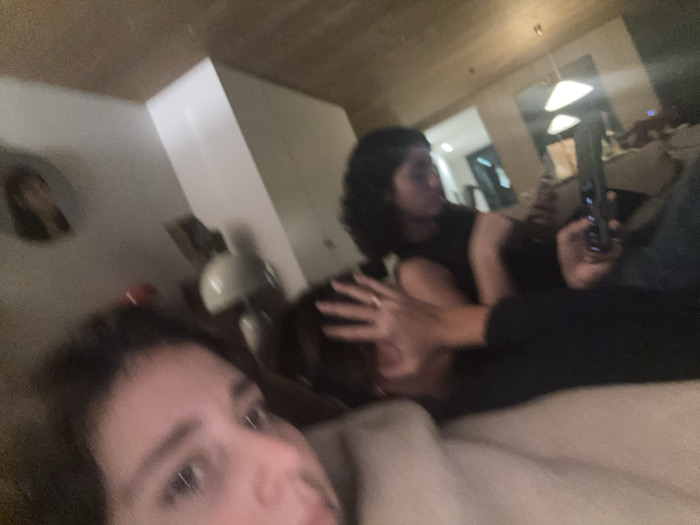 A dimly lit indoor scene captures three people on a couch. The camera focuses closely on one individual’s face, appearing in the foreground, while another covers their face with their hand. A third person sits in the background, holding a device. The setting includes interior elements like a lamp, wall decor, and overhead lighting. The overall image is somewhat blurry and off-center.