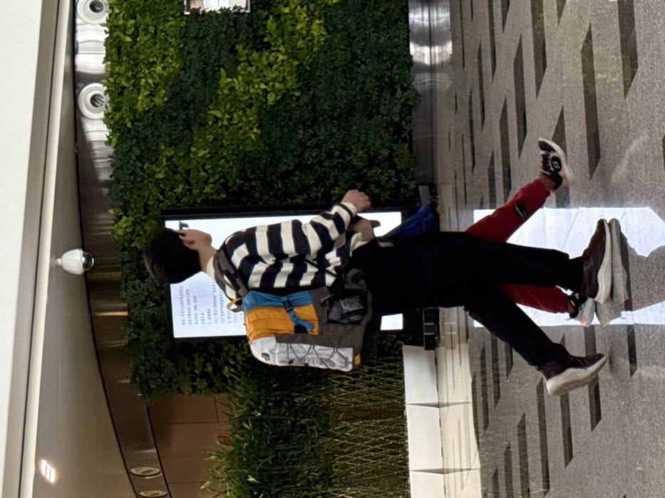 The image depicts an indoor public or commercial space in Langfang, China. Two individuals are walking from left to right on a polished, reflective tiled floor with light and dark grey rectangular patterns. The primary subject, a young individual, is positioned centrally, viewed from the back-right. This person wears a black and white horizontally striped long-sleeve shirt, dark-colored pants, and brown athletic-style shoes with white soles. A multi-colored backpack, featuring sections of orange, blue, and grey/white with a bungee cord system on the grey/white section, is worn. A small, light-colored object is held in the subject's right hand. A second individual is partially visible behind and to the left of the primary subject, primarily showing the lower torso and legs. This individual wears red pants and athletic shoes with dark uppers and light soles. The background features a large vertical garden (living wall) composed of dense green foliage on the right. In the center, a tall, rectangular digital display screen with white text, likely Chinese characters, on a dark background is partially obscured. To the left, a planter contains tall, thin green plants. The white ceiling is fitted with recessed lighting and two dome-style security cameras. The environment is brightly lit by artificial light sources.