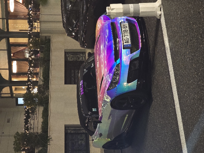 A nighttime scene in Monaco, Monaco, depicts a street with a highly customized car parked on asphalt. The central subject is a two-door convertible sports car, possibly an Opel GT Roadster or Pontiac Solstice, which is covered in a reflective, iridescent wrap that shifts between vibrant pink, purple, blue, and teal hues. The car has a black soft top, black multi-spoke wheels, and a French license plate "AG-778-BY" affixed to its front bumper. A pink "NCB" decal is visible on the upper section of the windshield. To the right of the iridescent car, the front quarter of a dark-colored SUV or larger vehicle is partially visible. In the immediate foreground, a white solid line marks the asphalt surface. A white, octagonal, plastic bollard with a reflective strip stands to the right of the iridescent car's front bumper. The background features a light-colored building with large arched windows on an upper level, through which interior lighting and light-colored curtains are visible. A decorative ledge or railing in front of this building level is adorned with strings of warm white lights and several small green plants. Below this decorated section, two rectangular windows with ornate black metal grates are visible. The overall illumination suggests artificial light sources in a nighttime environment.