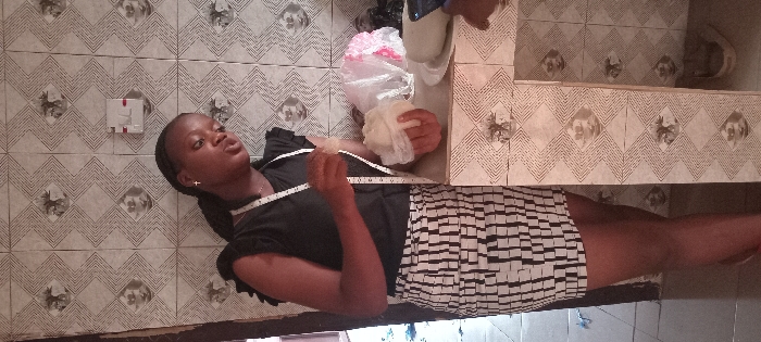 An indoor scene in Aba, Nigeria, depicts a young adult female standing beside a tiled counter, engaged in what appears to be food preparation