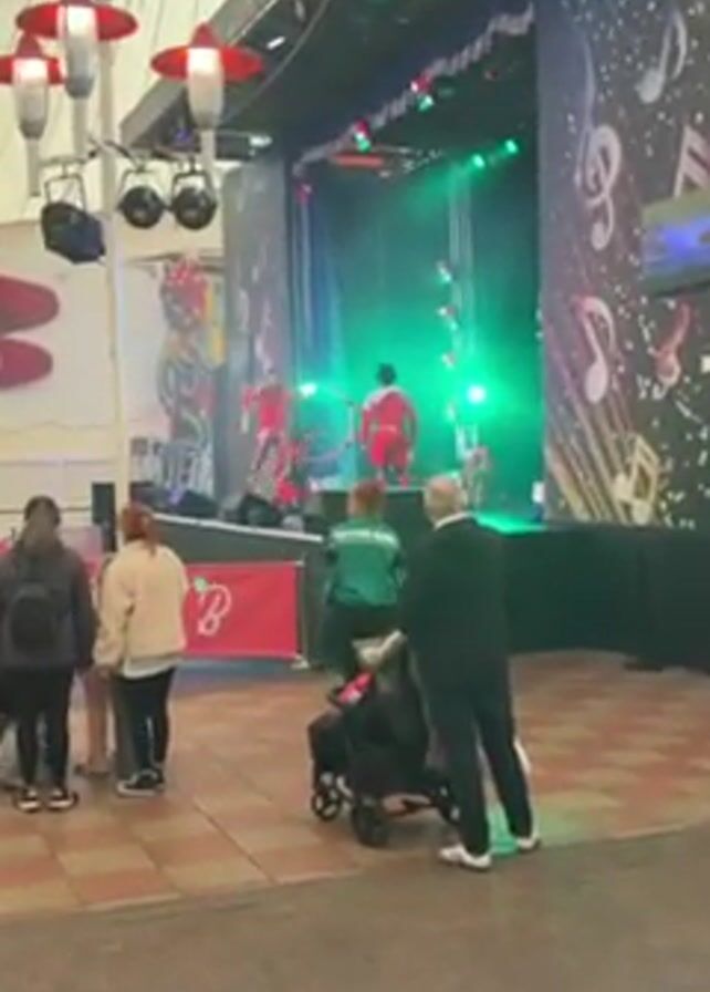 group of people watching a performance on a stage. The stage is decorated with musical notes and lights. The performers are wearing red outfits, and one of them is using a hula hoop. The audience includes families with strollers. The environment appears to be an indoor event space or amusement park, indicated by the tent-like structure overhead and decorative elements.