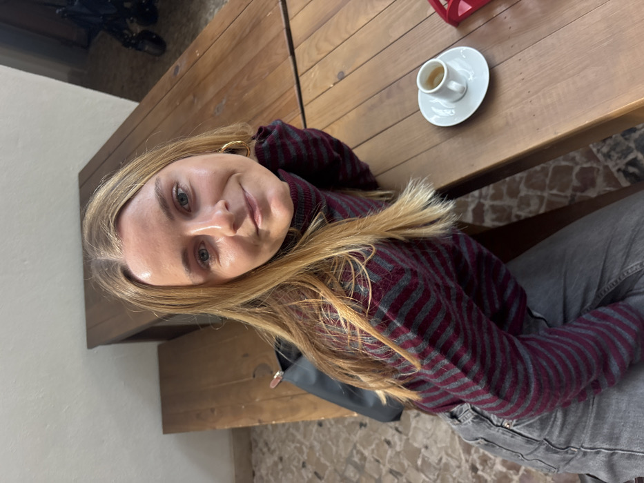 The image displays a female subject seated at a wooden table within an indoor establishment, identified as being in Porto Salvo, Portugal. The female has long, straight blonde hair with a middle part, fair skin, and blue eyes. She is wearing a long-sleeved, high-necked sweater with alternating horizontal stripes of dark red and dark grey, paired with grey jeans. She is looking directly at the camera with a subtle smile, with her right arm resting on the table surface. To her right, on the wooden tabletop, a white ceramic espresso cup holding dark liquid is positioned on a white saucer. A dark-colored handbag with a visible brown strap accent is situated on the wooden bench to her left. The furniture comprises robust wooden tables and integrated benches. The flooring consists of small, irregularly shaped reddish-brown and dark grey tiles. The background features light-colored walls, and a dark, indistinct object, possibly a wheeled item such as a stroller, is partially visible in the distant right section of the frame.