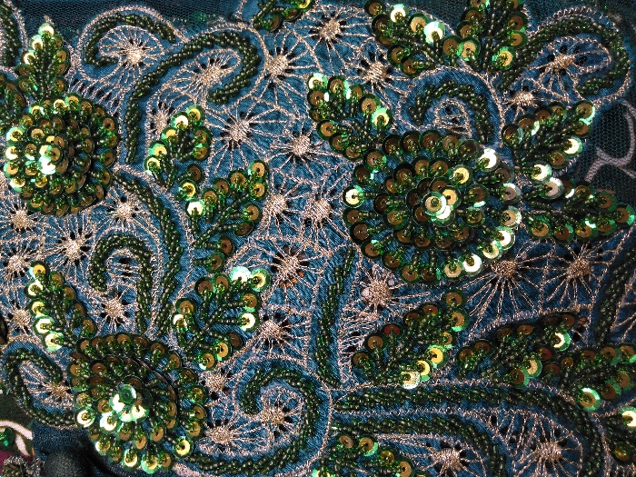 The image displays a detailed, macro-level view of an elaborately embroidered and beaded textile