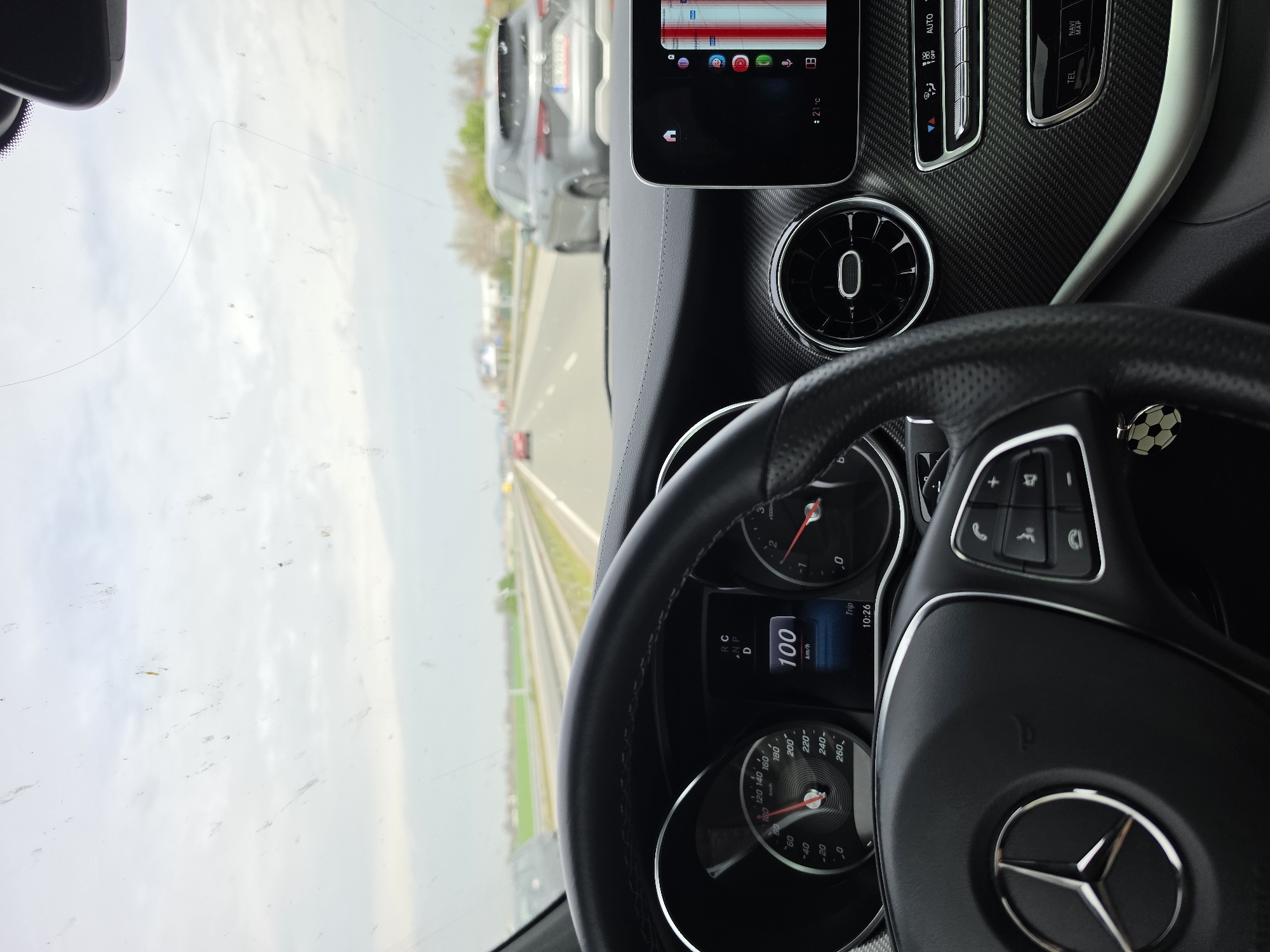 interior of a Mercedes-Benz car, specifically the dashboard and steering wheel. The speedometer indicates a speed of 100 km/h. The navigation screen shows a map, and the air conditioning is set to 21°C. The environment visible through the windshield appears to be a highway, with other cars and a grassy landscape. The location in Krumovo, Bulgaria, cannot be determined from the image.