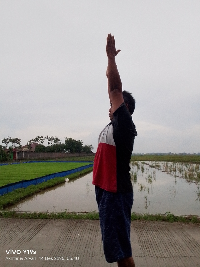 A man standing in a rural setting with arms raised, palms forward. He is wearing a t-shirt with black, white, and red panels, and dark shorts. Behind him are flooded fields with young plants. A road runs in front of the fields, and beyond them are trees and houses under an overcast sky. A watermark indicates the photo was taken with a Vivo Y19s on December 14, 2025, at 05:40.
