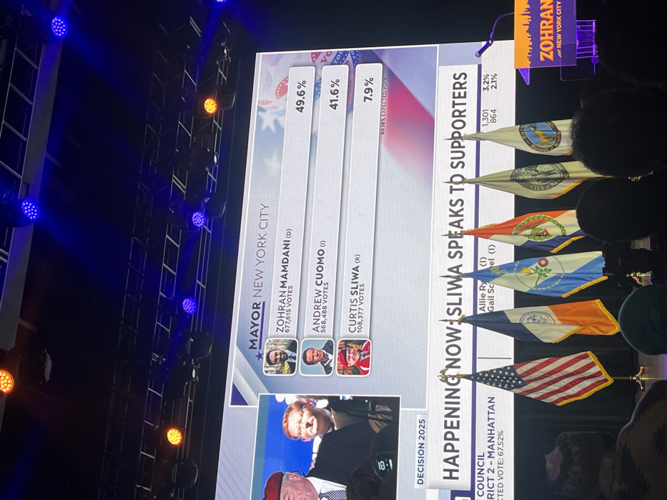 A screen displays New York City mayoral election results with Zohran Mamdani (D) at 49