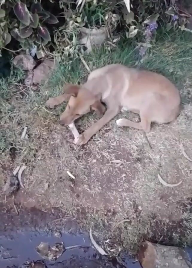 A light brown, medium-sized dog is chewing on a large bone while lying on its side on a patch of grass and dirt. A small puddle of water and a log are visible near the bottom edge of the frame. Various plants are in the background, including some with purple and green foliage.