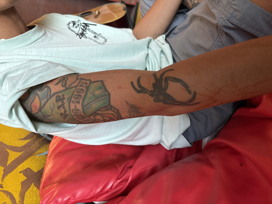 An individual is depicted from the mid-torso up, seated in ตำบลเกาะพะงัน, Thailand. The person is wearing a light blue-green short-sleeved t-shirt with a black graphic logo on the left chest, and grey shorts. Their right arm, tattooed, is prominently featured. On the upper arm, a multi-colored tattoo of a tombstone reads "R.I.P." with "1979-1995" on a banner below, surrounded by floral elements. On the forearm, a dark, stylized spider tattoo is visible. Faint, reddish-brown line patterns are present on the lower forearm, possibly temporary body art or skin marks. To the left, a bright red cushioned surface, likely a sofa or chair, is visible. The background consists of a wall featuring abstract yellow and brown graffiti art.