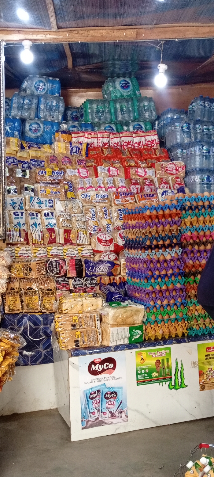 The image depicts a well-stocked provision stall or shop in Aviation Quarters, Nigeria
