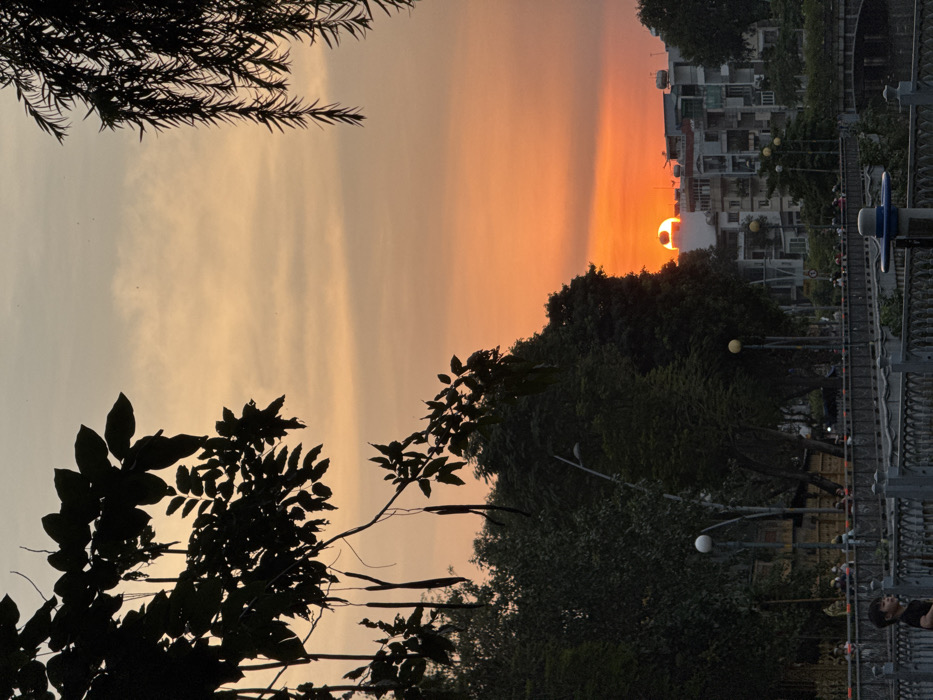 The image presents an urban landscape during either sunrise or sunset in Thủ Đức, Vietnam, characterized by a prominent orange and yellow sky. The sun, a bright orange disk, is partially visible above a cluster of multi-story residential or commercial buildings on the mid-right, with its lower arc obscured by rooftops. The upper portion of the frame is bordered by silhouetted tree foliage: broad leaves with several elongated, pendulous pods on the left, and fine, drooping, needle-like leaves on the right. A dense line of dark green trees runs across the mid-ground, behind which multiple streetlights with white and yellow globes are positioned. Below this tree line, a pedestrian bridge or promenade with a grey, decorative railing extends horizontally across the scene. Numerous individuals, primarily visible in silhouette, are present on this structure, appearing to walk or stand. In the lower-left foreground, a young child in a dark shirt is clearly visible, facing towards the right. A distinctive blue and white bollard or similar urban fixture is attached to the bridge railing in the immediate foreground. The area beneath the bridge is cast in deep shadow, suggesting a lower elevation, possibly a waterway or street.