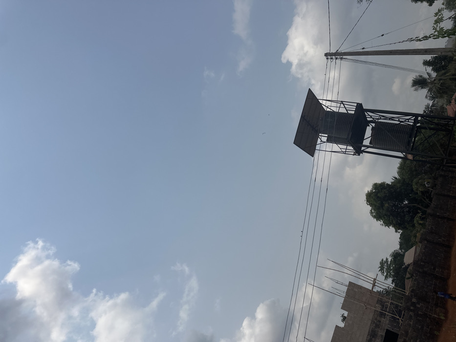 The image depicts an outdoor scene in Agbogugu, Nigeria, under a bright, partly cloudy sky. The dominant features include a tall, dark-colored metal water tower on the right, equipped with two vertically stacked cylindrical water tanks and topped with a flat, dark protective roof. To the immediate right of the water tower stands a utility pole supporting multiple horizontal power lines, on which two small birds are perched. Small, dark specks, possibly birds, are visible in the sky above the water tower. In the mid-ground on the left, an unfinished concrete block structure with visible bamboo scaffolding indicates ongoing construction. Below this structure, a dark, low-rise perimeter wall extends horizontally across the frame. Behind the wall and water tower, various green trees and foliage are present, including identifiable palm trees. The foreground consists of reddish-brown earth. A lone individual, dressed in a blue shirt and dark trousers, is partially visible walking from left to right in the lower-left corner, mostly obscured by the perimeter wall. The scene suggests a semi-urban or rural environment with developing infrastructure.