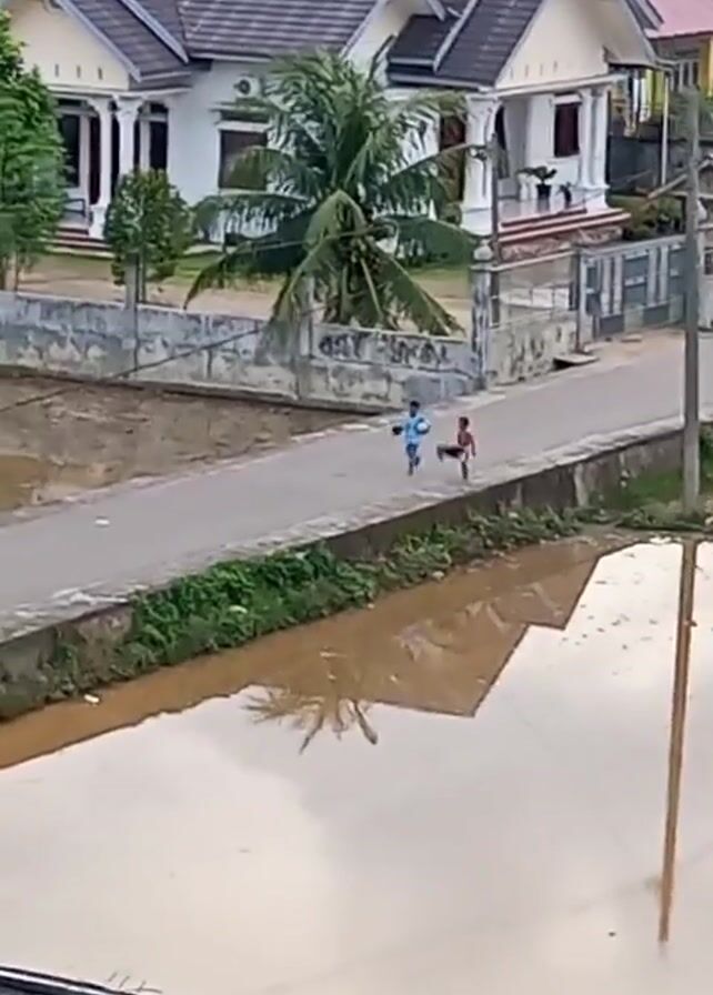 two children running on a concrete path next to a waterway filled with muddy water. The child in front wears a blue shirt and the child behind wears a light-colored shirt. Both are moving to the right. The path runs between flooded areas on either side. In the background is a white house with a gray roof and a palm tree. The video is taken from an elevated position, possibly from a building, with the foreground showing a dark, textured surface. The muddy water reflects the house and the sky.