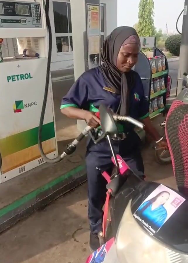 A woman wearing a black headscarf and a blue uniform with green trim is filling a white motorcycle with gas at a petrol station. The gas pump is branded "PETROL" and "NNPC." Another man is visible in the background filling another motorcycle. A fire extinguisher is visible near the gas pump. The woman is focused on filling the gas tank. A sticker with a woman's face on it is attached to the motorcycle. The motorcycle has a striped red and black net seat cover.