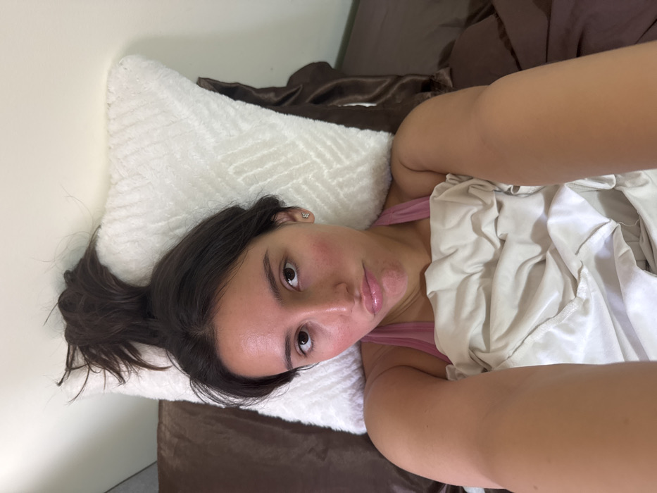 An indoor, high-angle selfie captures a young adult female lying in a bed in Ramat HaSharon, Israel. She possesses a medium-dark complexion, dark hair gathered into a high, messy bun, and wears a light pink, possibly athletic, top. Her facial expression exhibits a slight pout, with full, glossy lips. Her cheeks and chin display some redness. Small, light-colored stud earrings are visible. She is partially covered by a crumpled, light beige blanket that extends from her mid-torso downwards. Her head rests on a white, textured, fluffy pillow. Dark brown or bronze satin-like bedding is visible beneath the pillow and along her left side. A plain, light-colored wall forms the background.
