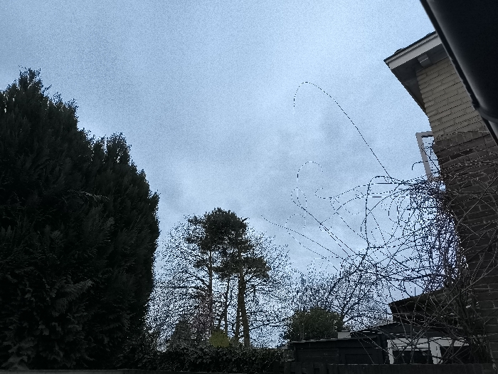 This image depicts an outdoor residential scene in Arnhem, Netherlands, viewed upwards against an overcast, light blue-grey sky. On the left, a large, dark green evergreen tree occupies approximately one-third of the frame. In the center and background, several deciduous trees with bare branches are visible, including a prominent tall conifer. The lower right foreground features a dense entanglement of bare, thorny branches or vines, some of which extend upward and outward into the sky area. In the upper right quadrant, a section of a brick building is visible, featuring a brown brick wall and a cream-colored roof fascia and soffit. Lower in the background, obscured by vegetation, are dark, indistinct structures that appear to be fences or sheds. No individuals or animals are present in the scene. The sky contains numerous faint, thin, dashed, and curving lines, indicative of lens smudges, condensation, or digital artifacts. Lighting is consistent with diffused daylight under an overcast sky.