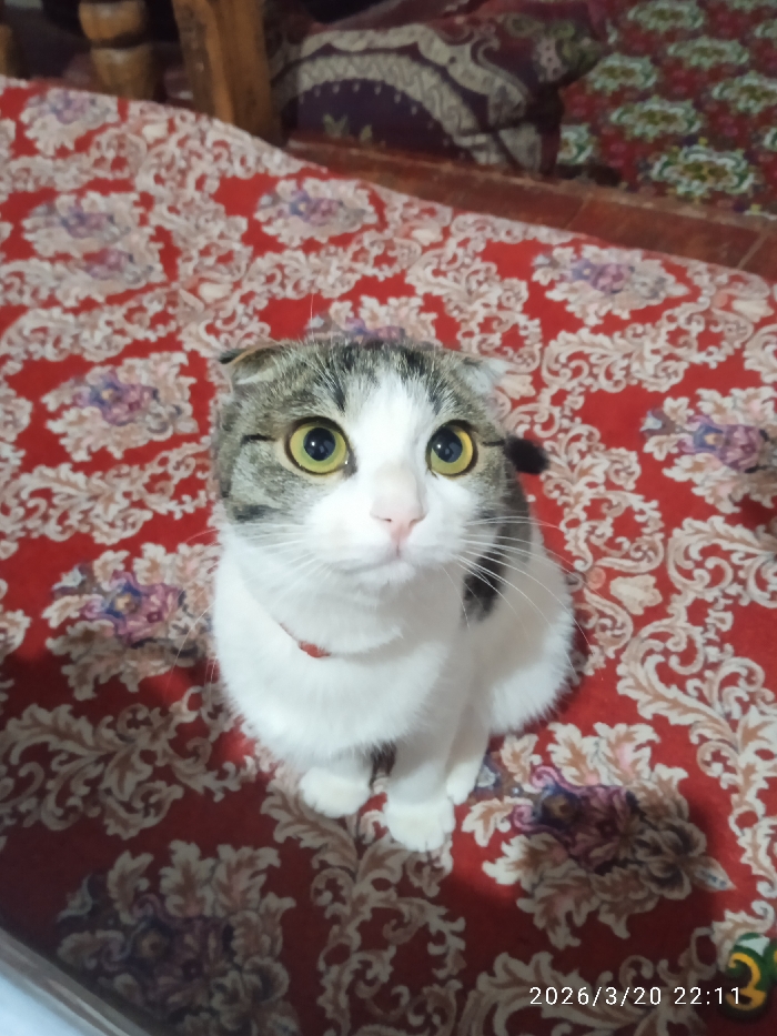 A domestic cat with white fur and grey/brown tabby markings on its head and face sits upright, facing the viewer, on a red patterned blanket or rug. Its ears are folded forward, characteristic of a Scottish Fold breed. The cat possesses large, round, yellowish-green eyes with dilated pupils and a light pink nose. A thin red collar is visible around its neck. The patterned fabric beneath the cat features white and purple damask-like motifs. In the upper background, a section of wooden furniture and additional patterned fabric, possibly cushions, in brown and purple hues are visible. A small, yellow and green object, likely a toy, is partially visible in the bottom right corner of the frame. The image was captured at 22:11 on March 20, 2026, within the city of Khujayli, Uzbekistan.