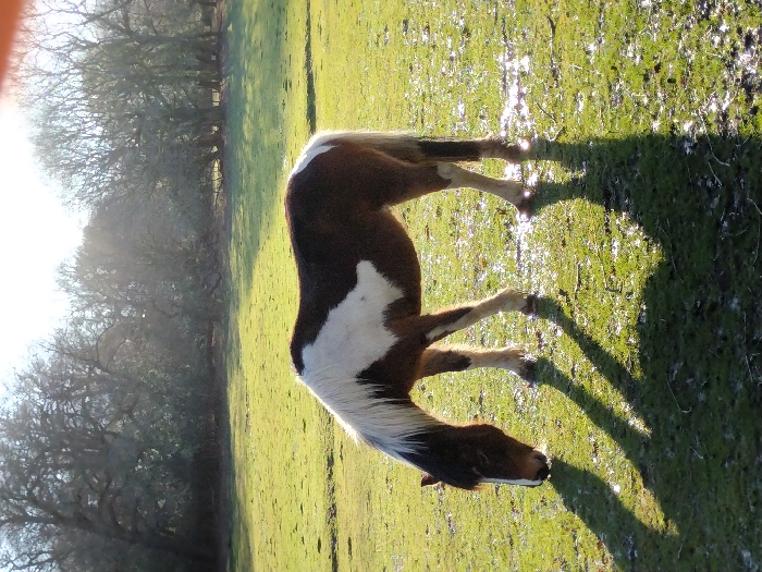 - "A single piebald horse, displaying dark brown and white irregular markings, with a white mane and tail, is depicted in a grassy field in the city of New Forest, United Kingdom" by FM-WOD6r2, licensed under CC BY 4.0