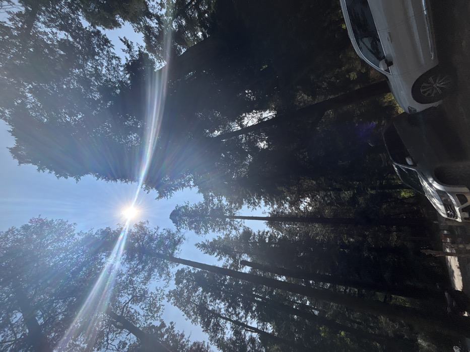 This image depicts a sunlit outdoor scene in a dense forest, located in the city of Unknown, Mexico. The sky is bright blue and clear, with the sun positioned centrally in the upper frame, casting strong lens flare and backlighting the surrounding trees. Numerous tall, evergreen trees with dark foliage dominate the upper two-thirds of the image, creating a thick canopy. In the lower foreground, two vehicles are parked on what appears to be an unpaved or dirt surface. On the left, a dark-colored SUV or pickup truck with silver front bumper details is visible. To its right, a white SUV is partially visible. No individuals are present in the frame. The overall environment is natural and illuminated by direct sunlight.