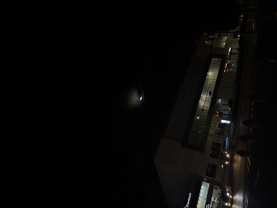This nighttime photograph depicts a street scene in Puebla City, Mexico, focused on the Federal Judicial Power (Poder Judicial de la Federación) building located on Boulevard Atlixco. The multi-story Federal Judicial Power structure occupies the central and right portions of the midground, characterized by its large, illuminated glass and concrete facades displaying the text "PODER JUDICIAL DE LA FEDERACIÓN." To the immediate left, a distinct building houses a Domino's pizza establishment, identifiable by its illuminated red and white corporate sign. The sky is dark, with a partially obscured, glowing moon visible through thin cloud cover in the upper center. The foreground shows a street with visible pedestrian crossing markings and several dark, conical bollards or traffic cones positioned along the edge. Multiple vehicles are present on the street; at least three cars are clearly visible with illuminated headlights, indicating active traffic. A red traffic signal is visible near the center-right of the image, positioned in front of the Federal Judicial Power building. The street pavement appears slightly reflective, suggesting damp conditions. No discernible individuals or explicit interactions are visible.