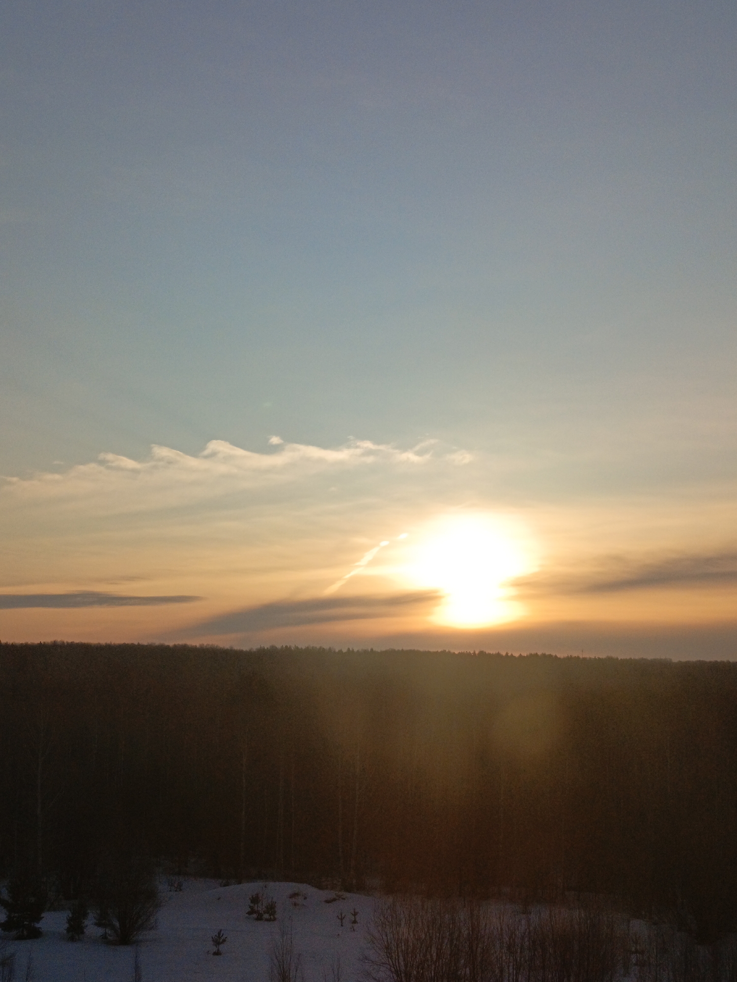 The image captures an outdoor winter landscape scene in the vicinity of Марковский, Russia, at either sunrise or sunset. The upper portion of the frame displays a sky transitioning from light blue at the top to warm orange and yellow tones closer to the horizon. Several white, wispy cloud formations are present, including distinct undulating clouds in the upper-left quadrant. A bright, intense light source, identified as the sun, is positioned in the mid-right sky, emitting a strong glow that diffuses light across the lower sky. A prominent, bright linear streak, consistent with a contrail, extends horizontally from the sun's vicinity towards the left. The horizon is marked by a dense, dark line of forested terrain, appearing as a silhouette. The foreground consists of snow-covered ground interspersed with sparse, mostly leafless trees and smaller evergreen bushes. No human figures or additional man-made objects are discernible within the frame.
