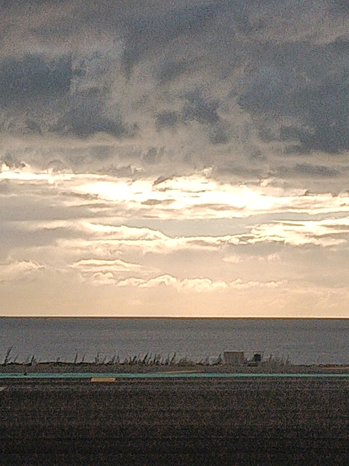 The scene depicts a coastal area within the municipality of Ingenio, Gran Canaria, Spain, specifically consistent with the vicinity of Gran Canaria Airport (GCLP). The image is horizontally segmented into three primary zones: sky, sea, and land. The upper two-thirds are dominated by a sky featuring an extensive layer of clouds. The upper cloud stratum is dark grey, while the lower cloud layers are brightly illuminated from behind, forming distinct horizontal bands of white and light grey light diffusion. A clear, straight horizon line separates the sky from the sea. The mid-ground comprises a calm, dark blue-grey body of water, appearing placid and devoid of significant wave action. The lower third of the image is occupied by land. Immediately adjacent to the sea is a narrow, light-brown coastal strip. On this strip, there are sparse, dark, vertical forms resembling low vegetation or boundary markers. Two distinct man-made objects are present on this coastal strip: a light-colored, rectangular building or container, and to its right, a darker, compact vehicle or piece of equipment. The immediate foreground consists of a vast, flat, dark expanse, consistent with an asphalt or concrete surface, such as an airfield or runway. A faint, short, yellow ground marking is discernible on this dark surface in the mid-left portion. A thin, horizontal light blue-green line traverses the mid-distance of this dark ground, likely a painted line, boundary, or channel. No individuals or discernible actions are present within the frame.