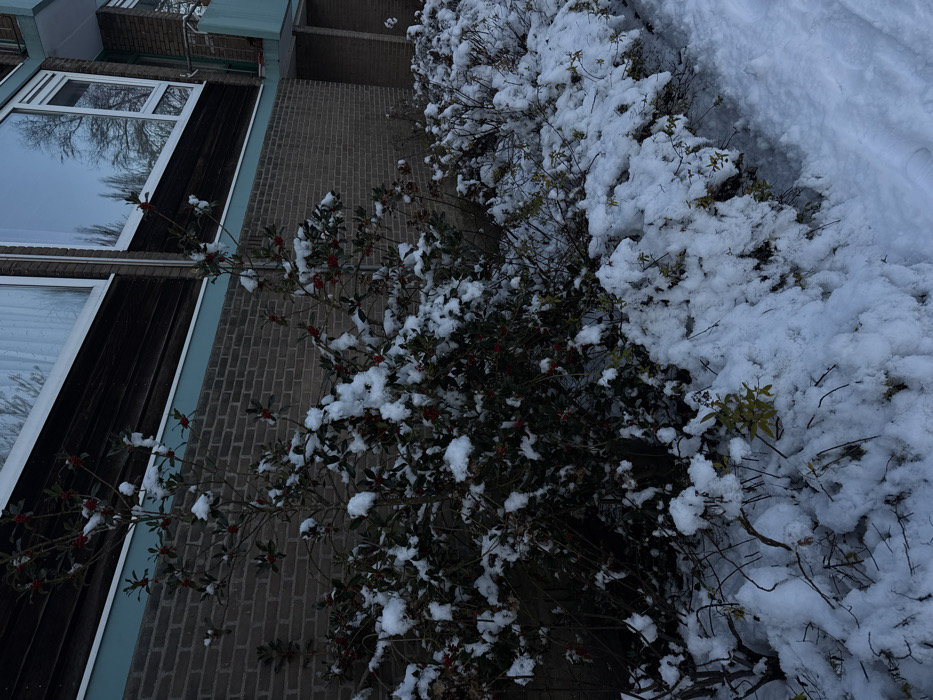 This image displays a snow-covered outdoor scene in Amstelveen, Netherlands