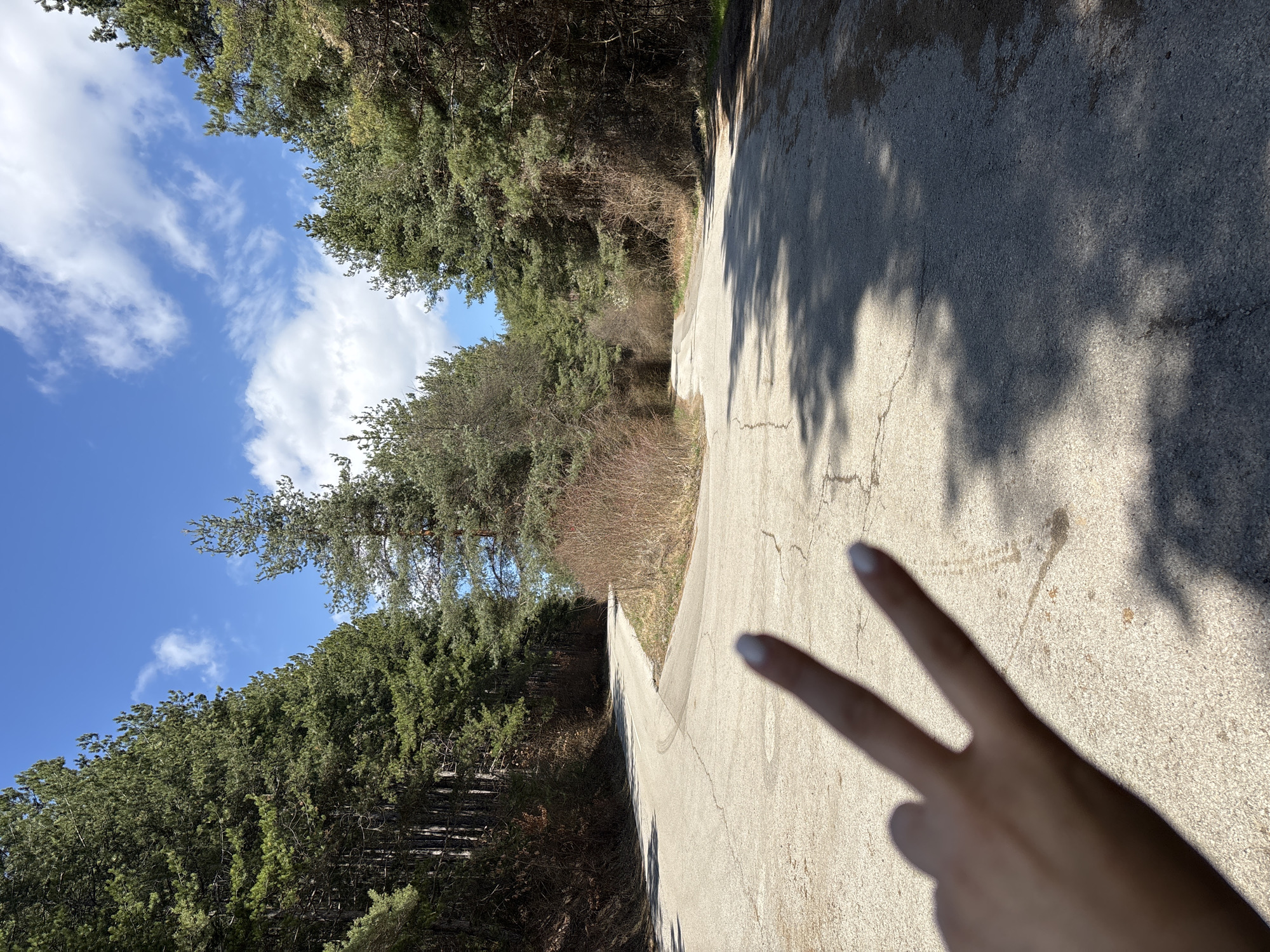 paved road winding through a forested area, likely in Kladnitsa, Bulgaria. The road surface is light-colored, with cracks and variations in tone, partially covered in shadows from the trees. The vegetation consists of trees with dense foliage. The sky is blue with scattered white clouds. A hand making a peace sign is partially in the foreground, casting a shadow on the road.