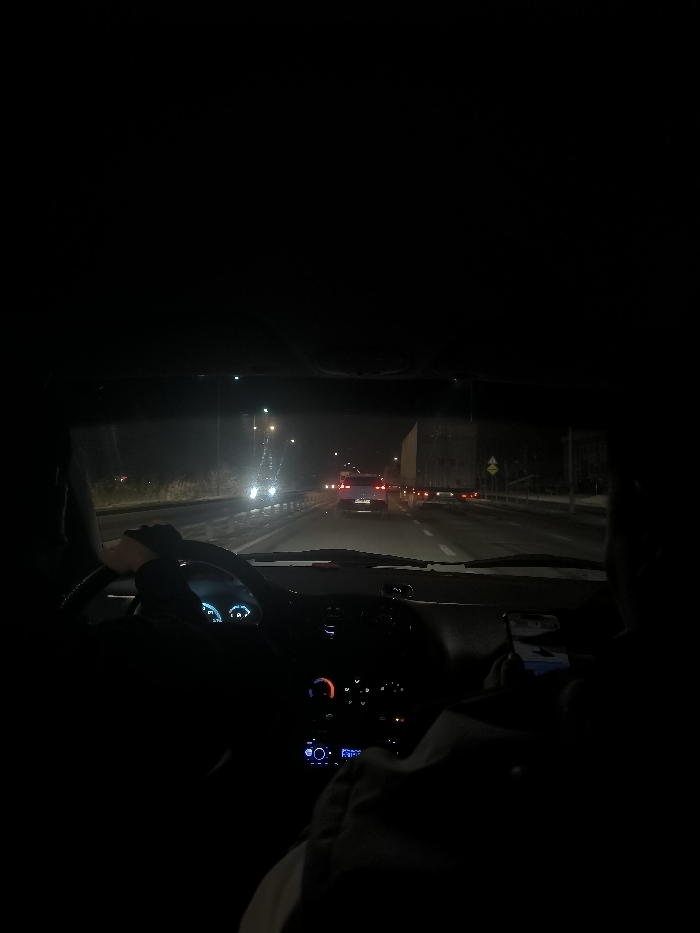 A dark car interior shows a driver at night