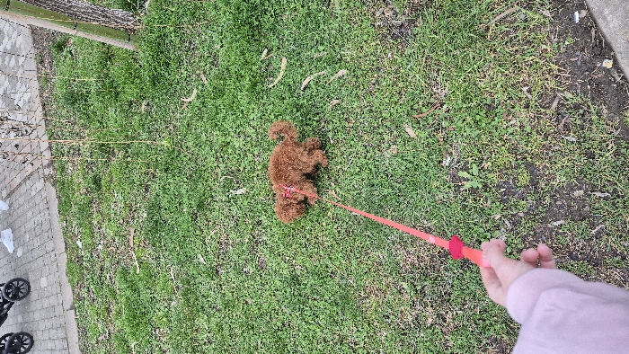 - "The image captures an outdoor scene in Batumi, Georgia, featuring a small, reddish-brown, curly-haired dog on a leash" by FM-hSE1y1, licensed under CC BY 4.0