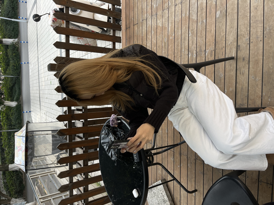 A woman with long, blonde hair sits at a black table on a wooden deck. She wears a black jacket with a knit sweater underneath and white pants. She is looking at a phone in her hands. On the table next to her phone is a black bag and an amethyst crystal. A pair of white earphones are also visible on the table. A white scooter is visible in the background behind a wooden fence.