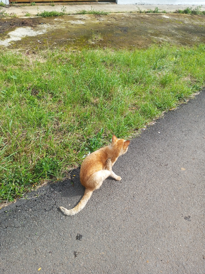 - "An orange tabby cat sits on a gray asphalt path, scratching its neck with its hind leg" by FM-JqEuv2, licensed under CC BY 4.0