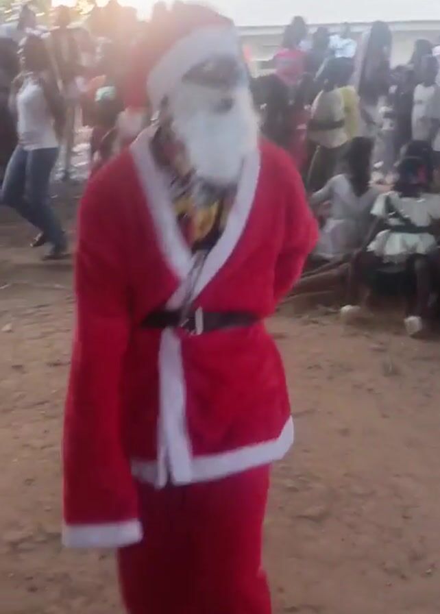 A person dressed as Santa Claus is standing in front of a crowd of people. The Santa suit is red with white trim, and the person is wearing a Santa hat, a white beard, and sunglasses. The person is on a dirt ground, with a mix of children and adults are visible in the background. The lighting suggests the scene is taking place during the day. The video mentions "Infinix Note 30 Pro" in the bottom left corner. The person dressed as Santa is moving slightly, likely dancing, with their arms out to the sides.