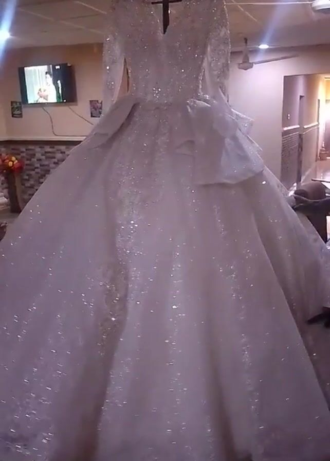 The video presents a white wedding gown displayed on a hanger. The gown features long sleeves, a V-neck, and a voluminous skirt with a tiered design. The fabric is adorned with glittery or sparkly accents. The dress is showcased indoors, against a backdrop that includes a television, brick-patterned wall accents, and glimpses of other furniture. The scene is well-lit, and the camera remains relatively static, focusing on the dress. At the bottom of the frame, there is a caption indicating "Shot on AWESOME A70".