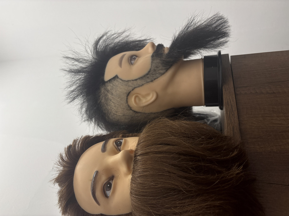 - "The image displays two male mannequin heads, used for barbering or hairstyling practice, positioned on a dark brown wooden surface against a plain white wall" by FM-I9aiE2, licensed under CC BY 4.0
