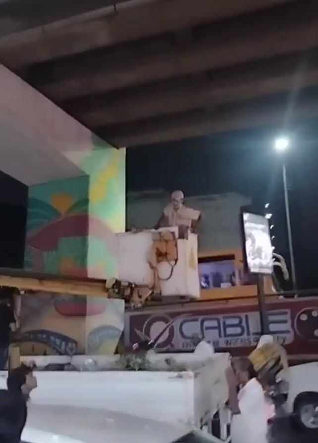At night, a man with a bald head is working from the bucket of a lift, seemingly painting part of a bridge support. He is wearing light-colored clothing and is seen standing in the bucket. The bucket is attached to a lift mounted on a truck. Below, several people in light-colored clothing stand near the truck. There is a sign for "CABLE" with the words "ensure quality" beneath. A painted mural with a sun, buildings, and abstract shapes is visible on the support. Other vehicles are visible, including a bicycle with items on the back and a white car. A streetlamp provides light, and the underside of the bridge is visible above. The camera is positioned below, looking up at the man and the bridge support.