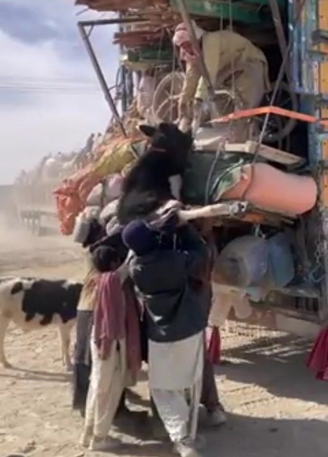 The video depicts a group of people attempting to load a black animal, possibly a cow or a bull, onto a heavily laden truck in a dusty, arid environment