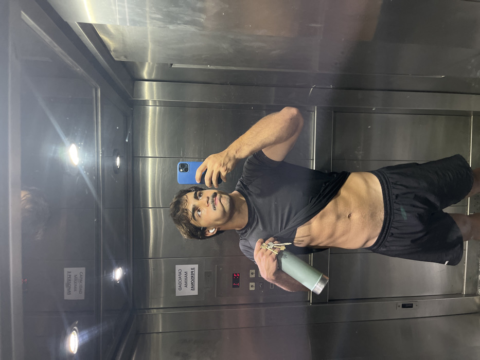 A shirtless man in black shorts stands in an elevator taking a selfie. He has a water bottle and keys in one hand and is lifting his shirt with the other to show off his abs. The elevator walls are stainless steel. The elevator panel shows the number "11" lit up.